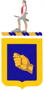 The regimental coat of arms and distinctive unit insignia were approved on 16 April 1929, and both were rescinded on 26 February 1959. The distinctive unit insignia consisted of a gold colored metal and enamel device 1 1/16 (2.70 cm) in height with a blue shield and a yellow border. A gold clenched hand with forefinger wrapped over the thumb was in the center of the shield. The regimental motto, "Mah be-ah" (Shoshone for We Defy) was attached to a scroll at the top of the insignia. The yellow represented the cavalry and the hand represented defiance in Indian Sign Language. The motto was in Shoshone due to the historical presence of Shoshone in the area where the regiment was organized. The coat of arms was of a similar design except that it omitted the motto and included the Organized Reserve Minuteman crest above the shield.[4]