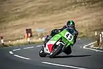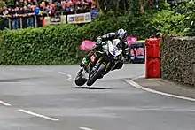 The number of turns in the course is debatable – writing in his 1974 book, TT racer and motorcycle journalist Ray Knight mentioned that the Guinness Book of Records quoted 264, echoed by a 2011 report.[1][2] Some of the curves, S-bends, turns at crossroads, and other features in the course would not seem significant to car drivers in public traffic, but they are very significant for high-speed racers. 135.452 mph (217.989 km/h) is the highest average speed that has been attained over one lap of the course, by Peter Hickman on 8 June 2018 when he won the Senior TT.[3] At jumps where most race machines rise clear off the ground, drivers of cars at slow speeds might not even notice a bump. At each corner, racers must consider adjusting their entry speed, focus on their pre-planned line, lean according to the nature of the turn, and anticipate accelerating, decelerating, turning again, or otherwise handling their machines as needed while exiting the turn.[4]