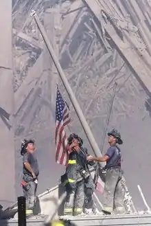 There was a scene cut from "33" where we saw Laura being given her copy of the photo along with a card that said it was taken on the roof of the capitol building on Aerilon during the attack. The photo was inspired by the famous shot of the fire-fighters raising the flag at Ground Zero that became iconic. I thought the Colonies would have their own version of this—a snapshot taken in the moment that becomes a symbol of the day they can never forget and of all they had lost. The photo itself is of a soldier falling to his knees (possibly shot or simply overcome by emotion) as he stands on the rooftop over looking the devastation of his city, while the Colonial flag waves at the edge of frame. The inscription below the photo on Laura's plaque reads, "Lest We Forget" in itself a reference to the inscription on the watch presented to John Wayne's character in She Wore a Yellow Ribbon.