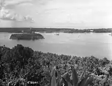 Prior to the landing, the battalion's training intensity was stepped up, including more practice landings,[25] and on 27 October, at 6:25 am, the 34th Battalion landed on Stirling Island at two beaches, designated Purple 2 and Purple 3. As expected, the landing was unopposed. The initial landing involved two companies, one at each beach. These secured the perimeter of landing zones before a third company landed and moved into the interior of the island to confirm the absence of Japanese.[26] With the island secure, a platoon moved over to nearby Mono Island to assist 36th Battalion in manning the perimeter it had established on that island.[27] In the meantime, while the Japanese were not physically on the island, they still carried out bombing raids at the landing zones.[27] On 29 October, the battalion detached another company to assist 29th Battalion and two days later a further company was sent to Mono Island to replace one of the hard pressed 36th Battalion's which in turn took over that company's positions on Stirling Island for a rest.[28]