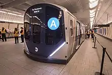 In 2017, part of the mezzanine was closed off so the MTA could build a mockup of the proposed R211 subway car.[77] The model was open to the public from November 30 to December 6, 2017.[78][79] The mockup contained features such as an open-gangway design proposed for this order; digital screens showing next stops and their station layouts; and a blue-and-gold-stripe paint design on its exterior.[77]