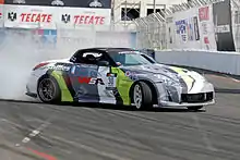 The 350Z is a popular platform for import events and drifting, where in the latter, drivers including Ryuji Miki, Youichi Imamura, Tyler McQuarrie and Tanner Foust have used them with success in the D1 Grand Prix and Formula D series.[25] During the 2006 D1 Grand Prix exhibition event at the Las Vegas Motor Speedway, Tanner Foust, driving a 350Z, became the first competitor to achieve a perfect score of 100.[26] Two Z33s competed in the non-Japanese domestic D1 Grand Prix spin-off series, D1 Great Britain. In the 2007 season, both SVA Imports and Sumo Power competed using 350Zs in the European Drift Championship. In Formula D, Foust was awarded the runner-up spot in Round 1.[27] In Round 2, Chris Forsberg scored a maiden victory[27] in his 350Z Roadster equipped with a VK56DE from a Nissan Titan.[28] Forsberg's win for the 350Z was followed-up by Youichi Imamura's win during the Las Vegas round of the US D1 Grand Prix series in his RB26DETT-engined car. Foust would eventually take his 350Z to the Formula D title.[29]