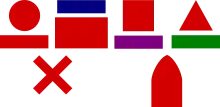 The practice of wearing battalion specific insignia (often called battle patches) in the B.E.F. began in mid 1915 with the arrival of units of Kitchener's Armies and was widespread after the Somme Battles of 1916.[12] The patches shown were worn by the division during 1917 and 1918.[13] There was an overall division scheme for the battle patches, colours for each brigade and shapes for each battalion.[14] This division also identified the companies within each battalion with an oblong coloured red for A company, dark blue for B Coy, purple for C Coy and green for D Coy, which could be worn above or below the battalion patch, as shown below. The patches were worn on both sleeves.[15]