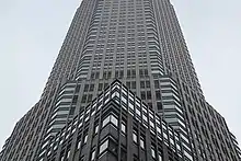 The building consists of an octagonal tower rising out of a rectangular base.[10][22][25] The lowest nine stories occupy the entire site, measuring 212 by 200 ft (65 by 61 m). Above a setback on the ninth story, the cross section of the 10th and 11th stories is rectangular, measuring 185 by 196 ft (56 by 60 m). There is a further setback at the 12th story, where the building shrinks to an octagon measuring 172 by 185 ft (52 by 56 m).[26] The octagonal tower sets back again at the 18th story (numbered as floor 14), where the building rises straight to its crown.[26][27] This design maximized the size of the perimeter wall, and it created eight corners for private offices on each story.[27]