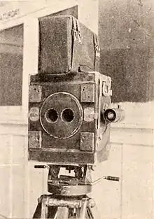 The earliest confirmed 3D film shown to an out-of-house audience was The Power of Love, which premiered at the Ambassador Hotel Theater in Los Angeles on September 27, 1922.[24][25][26] The camera rig was a product of the film's producer, Harry K. Fairall, and cinematographer Robert F. Elder.[19] It was filmed dual-strip in black and white, and single strip color anaglyphic release prints were produced using a color film invented and patented by Harry K. Fairall. A single projector could be used to display the movie but anaglyph glasses were used for viewing. The camera system and special color release print film all received U.S Patent No. 1,784,515 on December 9, 1930.[27][28] After a preview for exhibitors and press in New York City, the film dropped out of sight, apparently not booked by exhibitors, and is now considered lost.