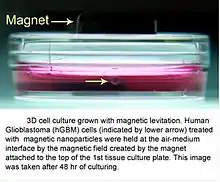 3D cell culturing by magnetic levitation method (MLM) is the application of growing 3D tissue by inducing cells treated with magnetic nanoparticle assemblies in spatially varying magnetic fields using neodymium magnetic drivers and promoting cell to cell interactions by levitating the cells up to the air/liquid interface of a standard petri dish. The magnetic nanoparticle assemblies consist of magnetic iron oxide nanoparticles, gold nanoparticles, and the polymer polylysine. 3D cell culturing is scalable, with the capability for culturing 500 cells to millions of cells or from single dish to high-throughput low volume systems.[1][2][3] Once magnetized cultures are generated, they can also be used as the building block material, or the "ink", for the magnetic 3D bioprinting process.