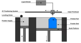 Similarly to selective laser sintering, binder jetting uses powdered food materials to create a model layer by layer. Instead of using heat to bond the materials together, a liquid binder is used. After bonding the desired areas of a layer, a new layer of powder is then spread over the bonded layer covering it. Certain parts of this new layer are then bonded to the previous layer. The process is repeated until the desired food model is constructed.