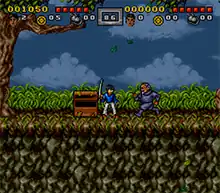 There is an initial character screen, where one of the three brothers must be chosen as the main character. The game itself is a very standard side scrolling platform game. Each of the characters has their own unique weapon. Rocky has a bo, Colt uses a katana, and Tum-tum wields twin sai. Enemies consist of rebel ninjas working for Koga, wild animals such as dogs and bats, and hazards such as moving boulders and spikes.