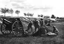 Throughout the 1930s the number of active personnel remained low and out of necessity training opportunities were limited.[64] After 1936, however, the Army attempted to improve the conditions of service for its members and to reinvigorate the training program, while individual units began to undertake their own recruiting campaigns.[65] Nevertheless, it was not until 1938, as tensions grew in Europe and the prospect of war became more likely, that an attempt was made to expand the establishment of the Militia. At this time an effort was made to determine the readiness of the Militia to expand if mobilised. During the continuous training camps undertaken throughout 1938, each component unit was assessed with mixed results.[66] The following year, 1939, saw further expansion and by the end of April of that year, the division's posted strength had grown to 9,589 personnel.[67] As a part of this expansion, the divisional artillery was expanded by the re-raising of the batteries that had been disbanded in 1922.[68]