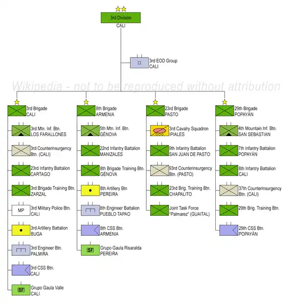 The 3rd Division (Spanish: Tercera División del Ejército Nacional de Colombia) is a Colombian National Army division based in the city of Cali consisting of four brigades: the 3rd Brigade based in Cali, the 8th Brigade based in Armenia, the 23rd Brigade based in Pasto and the 29th Brigade based in Popayán. The division is also supported by the 3rd Explosive Ordnance Disposal Group based in Cali.