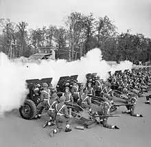 The regiment was withdrawn to Libya to rest and refit thereby missing the Sicilian campaign.[26] It next took part in the Italian campaign: the Salerno Landings (9 – 18 September 1943), the Capture of Naples (22 September – 1 October), and the Volturno Crossing (12 – 15 October).[24] It then returned to the United Kingdom, arriving on 4 January 1944.[26] It continued to support 7th Armoured Division, as a follow up formation, following the Normandy Landings In 1945, the regiment led the Allied Victory parade in Berlin, and fired the Victory Salute.