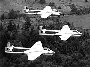 No. 410 Squadron was reactivated on 1 December 1946 as an Air Defence squadron flying de Havilland Vampire F.3 aircraft, and was re-formed from a defence role into that of a fighter role at St Hubert (Montreal), Quebec on 1 December 1948.[3][10] From May 1949 to August 1951, the Blue Devils aerobatics team formed, to demonstrate the abilities of the new Vampire aircraft at formation flying. The squadron later converted to Canadair Sabres and was deployed to Europe, flying from RCAF Station North Luffenham in the UK, and then at RCAF Station Marville (No. 1 (Fighter) Wing) in France. The squadron had been the first regular force fighter unit to fly the Vampire aircraft and was the first to fly the Sabre and the first to join No. 1 (Fighter) Wing of No. 1 Air Division Europe.[3][10]