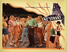 42nd Street is a 1933 American pre-Code musical film directed by Lloyd Bacon, and a script by Rian James and James Seymour (plus uncredited contributions by Whitney Bolton), adapted from the 1932 novel of the same name by Bradford Ropes. Starring an ensemble cast of Warner Baxter, Bebe Daniels, George Brent, Ruby Keeler, Dick Powell and Ginger Rogers, the film revolved around the rehearsals of a Broadway show at the height of the Great Depression, and its cast and crew. The film was choreographed by Busby Berkeley, with music by Harry Warren and lyrics by Al Dubin.