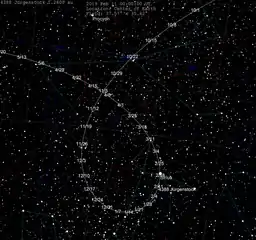 4388 Jürgenstock, provisional designation 1964 VE, is a bright Phocaea asteroid from the inner regions of the asteroid belt, approximately 4.7 kilometers (2.9 miles) in diameter. It was discovered on 3 November 1964, by astronomers at Indiana University during the Indiana Asteroid Program at Goethe Link Observatory in Indiana, United States.[1] The assumed S-type asteroid has a short rotation period of 2.8 hours and is rather spherical in shape.[4] It was named for German-Venezuelan astronomer Jürgen Stock.[1] In February 2019, the asteroid occulted the brightest star in the night sky, Sirius.