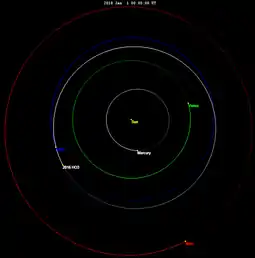 Kamoʻoalewa orbits the Sun at a distance of 0.90–1.10 AU. Although the period as of 2022 is about 366 days, its longer-term average period is closer to 365 days since it is a quasi-satellite of Earth and will continue to be so for hundreds of years. Its orbit has an eccentricity of 0.10 and an inclination of 8° with respect to the ecliptic.[2] It has an Earth minimum orbital intersection distance of 0.033 AU (4.9 million km) that translates into 13 lunar distances.[2] This distance is well outside of Earth's Hill sphere of 1.5 million km (3.9 LD).