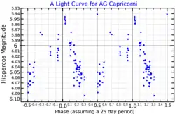 47 Capricorni is a variable star located around 1,170[2] light years from the Sun in the southern constellation Capricornus,[7] near the northern border with Aquarius. It has the variable star designation of AG Capricorni and a Bayer designation of c2 Capricorni;[8] 47 Capricorni is the Flamsteed designation. This object is visible to the naked eye as a dim, red-hued point of light with an apparent visual magnitude that varies between 5.90 and 6.14. The star is receding from the Earth with a heliocentric radial velocity of +20 km/s.[6]