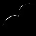 The longest axes of the lobi are nearly aligned with the rotational axis, which is situated between them.[43] This near-parallel alignment of the lobi suggests that they were mutually locked to each other, likely due to tidal forces, before merging.[43] The alignment of the lobi supports the idea that the two had individually formed from the coalescence of a cloud of icy particles.[51]