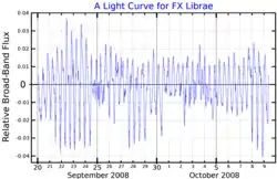 48 Librae is a single[5] shell star in the constellation Libra. It is a variable star with the designation FX Lib, ranging in magnitude from 4.74 to 4.96.[6] Based upon an annual parallax shift of 6.97±0.24 mas as seen from Earth's orbit, it is located around 470 light years from the Sun. It is a candidate member of the Upper Scorpius group of the Scorpius–Centaurus association, with the former having an age of about 11 million years.[10]