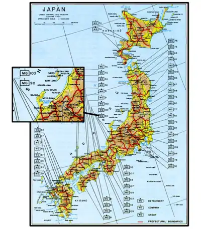 According to an operational map of military government units in Japan as of January 1946, the 90th Military Government is designated as a company-sized element operating in Kanazawa, Ishikawa Prefecture.[3]