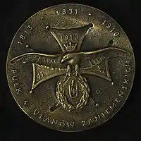 On 13 December 1921, Polish military authorities accepted the regimental badge. Its shape was similar to the Virtuti Militari Cross, with a Polish eagle superimposed on it. The cross had the date 11 XI 1918, number 4 and letter U. The badge was designed by Witold Lada-Zablocki and manufactured by Teodor Filipski from Wilno.