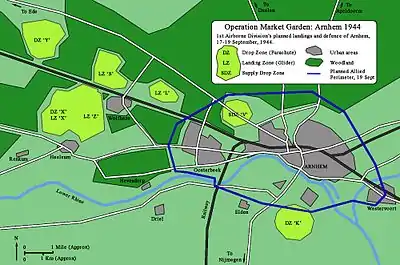 The division's fourth unit, the 1st Polish Parachute Brigade, were to arrive on day three, dropping their glider troops in the north and their paratroops south of the river.[33] Once all units were in place, the division was to form a defensive ring around the Arnhem bridges until relieved by the advance of XXX Corps 60 miles (97 km) to the south.[33]