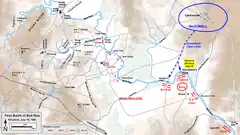 As the 4th Pennsylvania's three-month term of enlistment expired on July 20, the soldiers of the regiment spent that day discussing whether they should remain with the army or return to Pennsylvania. McDowell sought to keep the regiment with the army for the upcoming battle, promising that the regiment would not have to serve more than two more weeks, but also stated that those who did not wish to continue their service would be sent to the rear. The appeals of McDowell and Hartranft to patriotic duty were partially successful: many in the regiment were willing to stay, but others wanted to muster out as scheduled due to their previous negative experiences with lack of equipment. The latter felt that they were entitled to a rest as they planned to reenlist in new three-year units, to be organized by officers of the regiment.[10] Preferring not to send the 4th Pennsylvania into battle understrength with only the men who wished to remain, McDowell, who considered the repulse at Blackburn's Ford the cause of the discord,[11] decided to send the entire regiment to be mustered out.[10] Hartranft and Captain Walter H. Cooke of Company K stayed with the army, serving on the staffs of Franklin's brigade and David Hunter's division, respectively.[2] Cooke, after finding that only a half dozen of his men stepped forward to fight in response to his question, left in disgust and initially started for the camp of the New York Fire Zouaves to serve as a private before being told he could be more useful with the staff of a unit.[12] Both Hartranft and Cooke distinguished themselves during the First Battle of Bull Run and were awarded the Medal of Honor in the late 1880s.[13][10]