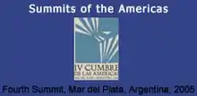 The 4th Summit of the Americas was held at Mar del Plata, about 400 km (250 mi) southeast of Buenos Aires in Argentina, on November 4–5, 2005.[1]