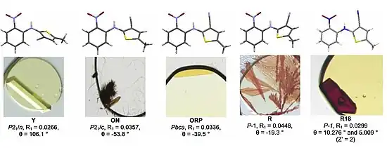 ROY has been crystallised in at least thirteen polymorphic forms.[7][8] Five of them, including red, orange and yellow examples are shown in Figure 1.