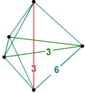 A 3-orthoscheme is easily illustrated, but a 4-orthoscheme is more difficult to visualize. A 4-orthoscheme is a tetrahedral pyramid with a 3-orthoscheme as its base. It has four more edges than the 3-orthoscheme, joining the four vertices of the base to its apex (the fifth vertex of the 5-cell). Pick out any one of the 3-orthoschemes of the six shown in the 3-cube illustration. Notice that it touches four of the cube's eight vertices, and those four vertices are linked by a 3-edge path that makes two right-angled turns. Imagine that this 3-orthoscheme is the base of a 4-orthoscheme, so that from each of those four vertices, an unseen 4-orthoscheme edge connects to a fifth apex vertex (which is outside the 3-cube and does not appear in the illustration at all). Although the four additional edges all reach the same apex vertex, they will all be of different lengths. The first of them, at one end of the 3-edge orthogonal path, extends that path with a fourth orthogonal √1 edge by making a third 90 degree turn and reaching perpendicularly into the fourth dimension to the apex. The second of the four additional edges is a √2 diagonal of a cube face (not of the illustrated 3-cube, but of another of the tesseract's eight 3-cubes).[lower-alpha 9] The third additional edge is a √3 diagonal of a 3-cube (again, not the original illustrated 3-cube). The fourth additional edge (at the other end of the orthogonal path) is a long diameter of the tesseract itself, of length √4. It reaches through the exact center of the tesseract to the antipodal vertex (a vertex of the opposing 3-cube), which is the apex. Thus the characteristic 5-cell of the 4-cube has four √1 edges, three √2 edges, two √3 edges, and one √4 edge.