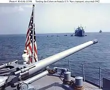 The 5-inch/51 caliber gun was designed to engage destroyers, torpedo boats, and other surface targets. The 5"/51 gun entered service in 1911 as secondary armament on the Florida-class battleships, which mounted 16. The guns served well through World War I, but increased awareness of the need for anti-aircraft protection (especially following the attack on Pearl Harbor) encouraged mounting of dual-purpose 5"/38 caliber guns in later battleships, and some of the World War I-era battleships were rearmed with dual purpose guns as well. Surplus 5"/51 guns from scrapped or rearmed battleships were mounted in United States Coast Guard cutters, auxiliaries, small aircraft carriers, coast defense batteries, and Defensively Equipped Merchant Ships.[3] A 1939 Table of Organization and Equipment shows Marine defense battalions were equipped with six of these guns each.[4] 5-inch/51 shore batteries were used with great effectiveness by the 1st Marine Defense Battalion during the Battle of Wake Island in December 1941. These were replaced in the defense battalions by the 155 mm Long Tom gun by 1943. Six Tambor-class submarines were rearmed with "wet mount" 5-inch/51 guns during World War II, taken from Barracuda-class submarines or spares for that class.