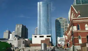 505, previously known as 505 CST and Paramount, is a residential skyscraper in downtown Nashville, Tennessee, located at the intersection of Fifth Avenue and Church Street. 505 stands on the location originally intended for the cancelled Signature Tower.[3] The 45-story building is 522 feet (159 m) tall[2] and feature 403,000 sq ft (37,400 m2) of floor space.[4] 505 is the tallest building in Nashville based on occupied floors,[6] and the second tallest overall behind the AT&T Building.[3] It includes 500 apartment units ranging from under 400 sq ft (37 m2) to more than 4,000 sq ft (370 m2),[6] with an option to later convert the top 175 units to condominiums.[4] Other planned areas include three retail spaces including an 8,000 sq ft (740 m2) ground-level restaurant,[6] a 45,000 sq ft (4,200 m2) amenity level,[4] and 690 parking spaces.[3] It is expected to cost US$169 million.[7] The architect is Solomon Cordwell Buenz.[3]