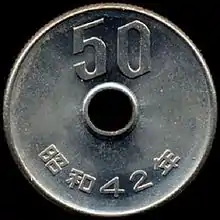 The 50 yen coin (五十円硬貨, Gojū-en kōka) is a denomination of Japanese yen. These coins were first minted in 1955, and concurrently circulated alongside a banknote denomination of the same amount. 50 yen notes were eventually pulled from circulation shortly before the center of the 50 yen coin was holed. The first yen coins were made of pure nickel and slightly larger than the ones used today. Changes to the 50 yen coin were made in response to events surrounding the 100 yen coin. The public wanted a different looking 50 yen coin while the mint wanted to stay consistent with the material used to make the coins. The current design was first minted in 1967 using Cupronickel rather than pure nickel.[1] The 50 yen coin continues to be minted for commerce, and is a collectible among hobbyists.