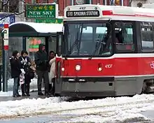 On June 18, 2012, all streetcar service on the line was suspended and replaced by buses.[9] This was to allow major track work to be completed in preparation for the TTC's new low-floor Bombardier Transportation custom-made Flexity Outlook streetcars which were scheduled to enter service on the Spadina line in 2014.[10] The upgrades were completed and full streetcar service was restored two years later on August 31, 2014, including a ceremony at 10:00 am when the first two accessible low-floor Flexity vehicles officially entered revenue service.[11]