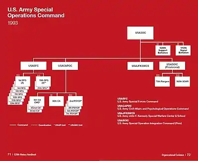 -8 December 1995 Special Operations Support Command is activated. A Table of Distribution and Allowances (TDA) unit, it provides a brigade-level headquarters for the 528th Support Battalion, 112th Signal Battalion, and USASOC MMC.