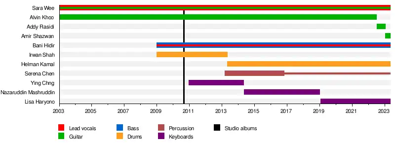 In December 2010, Chng Hui Ying, better known as Ying Chng, joined the band on keyboards. In May 2011, Serena Chen joined the band as a percussionist. She became a permanent member the band in March 2013. Irwan Shah left the band in May 2013 to focus more on his career as a music examiner, and was replaced by Helman Kamal.