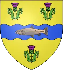 The battery coat of arms is a gold-blue-gold stable belt derived from the "Shield" of Nova Scotia 1867–1929, representing the earth banks either side of the St Lawrence River as authorised circa 1904. The shield depicts 3 thistles, which represent the 3 municipalities of Nova Scotia (New Scotland) and the salmon is shown swimming west.