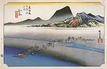 The 53 Stations of the Tōkaidō (東海道五十三次, Tōkaidō Gojūsan-tsugi) are the rest areas along the Tōkaidō, which was a coastal route that ran from Nihonbashi in Edo (modern-day Tokyo) to Sanjō Ōhashi in Kyoto.[1] There were originally 53 government post stations along the Tōkaidō, where travelers had to present traveling permits at each station if wanting to cross.