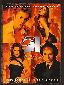 54 is a 1998 American drama film written and directed by Mark Christopher.[3] Its plot focuses on the rise and fall of Studio 54, a famous nightclub in New York City during the late 1970s and early 1980s. The film stars Ryan Phillippe, Salma Hayek, Neve Campbell, and Mike Myers as Steve Rubell, the club's co-founder.