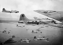 The squadron arrived at its combat station, RAF Framlingham in July 1943 and flew its first combat mission on 12 August against targets in the Ruhr. Five days later, the squadron attacked the Messerschmitt factory at Regensburg, for which it earned its first Distinguished Unit Citation (DUC).[4] The Regensburg mission was a "shuttle" mission, and the squadron continued after striking the target to recover at Twelfth Air Force bases in North Africa. Poor weather at the departure bases extended the time required to assemble the strike force, making fuel reserves critical. Half of the fighter cover missed the rendezvous, lessening the bombers' protection. For an hour and a half after its entry into German airspace, the strike force bore attacks from German interceptors. The 390th Group suffered the heaviest losses of the leading wing, but had the best bombing results, which destroyed equipment used for the assembly of the Me 262 jet fighter, delaying its introduction into service.[6]