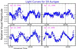 This object is a Delta Scuti variable, meaning it varies in luminosity due to pulsations on its surface, ranging in magnitude from 5.94 down to 6.14 with a period of 0.154412 days (3.7 h).[6] For that reason, it has been given the variable star designation OX Aurigae. The star's spectrum matches that of an F-type main-sequence star and it has a spectral type of F2V.[4] It has 2.5[9] times the mass of the Sun and 5.7[2] times the Sun's radius. 59 Aurigae is thought to be around 700 million years old, and is radiating 64[2] times the Sun's luminosity from its photosphere an effective temperature of 6,808 K.[8]