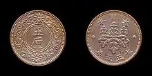 The five rin coin (五厘青銅貨) was a Japanese coin worth one two-hundredth of a Japanese yen, as 5 rin equalled +1⁄2 sen, and 100 sen equaled 1 yen.[1] These coins were a successor to the equally valued half sen coin which was previously minted until 1888. Overall, the history of the five rin coin is brief as they were only minted from 1916 to 1919 before being devalued monetarily. They were later demonetized by the end of 1953 and are now widely available for collectors.