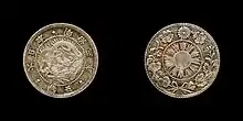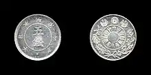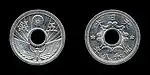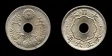 The 5 sen coin (五銭硬貨) was a Japanese coin worth one twentieth of a Japanese yen, as 100 sen equalled 1 yen.[1] These coins were minted from the late 19th century until the end of World War II. Like the other denominations of sen, these coins were eventually taken out of circulation at the end of 1953.[2] While not in circulation any more, these coins are bought and sold by numismatists for academic study, and by those with a hobby.