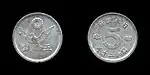 Five sen coins were brought back into production by the Japan Mint in September 1945. The initial plan was to use the design featured on the previous five sen aluminum coins. These coins were never released, and all of them were melted as permission was not granted by the Supreme Commander for the Allied Powers.[57] Criticism fell upon the prewar design, and how the country's name read "大日本" (Dai Nippon, Japanese Empire) on the coins. The solution was to redesign the coin entirely and replace the name with "日本政府" (Nippon-koku, Government of Japan).[58][59] Tin was chosen again for an alloy as aluminum was below the coin's face value.[60] These final five sen coins are the same 17mm size as their predecessors, but weigh an even 2 grams (up from 1.95). The design features a chrysanthemum seal with a dove (symbol of peace) on the obverse, while the reverse has a large Latin numeral "5".[60][57] Issuance came on January 26, 1946 by royal order after the coins were approved.[61] These coins continued to be produced until supplies ran out sometime in 1946 (year 21).[57] Five sen coins were eventually demonetized at the end of 1953 when the Japanese government passed a law abolishing subsidiary coinage in favor of the yen.[2] Currencies of less than one yen were rarely used by this time due to excessive post-war inflation.[62]