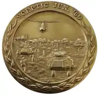 61 Mech awarded a small badge called the Operational Badge for those in or attached to the unit who deployed with the unit on operational duties.[3]:14 The badge had a yellow backing and was awarded initially only for cross border operations into Angola.[3]:14 A subsequent version with a green backing was suggested which was to be for internal duties. This version was never authorised and the yellow badge was awarded for all operational deployments. The badge consisted of a dagger with three diagonal lightning bolts in red across it. A subdued version was produced for wear on nutria (brown's) uniforms. With the introduction of camouflage, a new version was produced on green thatching.