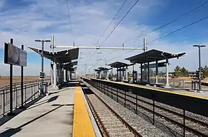 61st & Peña station (sometimes stylized as 61st•Peña) is a Regional Transportation District (RTD) commuter rail station on the A Line in Denver, Colorado. The station, accessible from Tower Road is located along Peña Boulevard, the sixth eastbound station from Union Station in Downtown Denver and first westbound from Denver Airport. It is about 28 minutes from Union Station and nine minutes from Denver Airport. 61st Avenue provides access from Tower Road to the station.