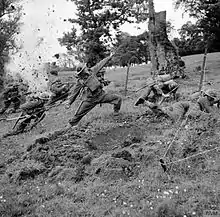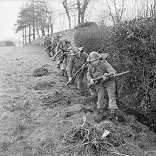 The 61st Division returned to England on 4 February 1943, and was based in Essex under the command of XI Corps.[37][44] Between 4–12 March, the division participated in Exercise Spartan, the largest military exercise ever held in the United Kingdom.[45] David French commented that the exercise "was designed to analyse the problems that would arise after a force had landed on a hostile shore and was advancing from a bridgehead". The exercise revealed weaknesses in elements of the senior leadership, in particular the officers in overall command of the armies deployed for the exercise, and highlighted the improvements made in general by the infantry.[45] Spartan was followed, in April and May, by Exercise Jantzen. This was an administrative undertaking by the division and the headquarters of I Corps, aimed at improving the support techniques that would be used in the upcoming invasion of Europe.[lower-alpha 2] In May, the division was transferred to II Corps, and moved to Kent, after which Major-General Charles Wainwright took command, holding this position until the end of the war.[18][44] The division was earmarked for a role in Operation Overlord,[47] and Marcus Cunliffe wrote that Exercise Spartan "seemed to be every indication that" the division was to be a front-line unit.[44] In September, the division, in conjunction with the 1st Polish Armoured Division, was placed under the control of II Canadian Corps for Exercise Link.[48] In the months following the exercise, the division was relegated to Lower Establishment status.[44][47] This meant that the division was now to be strictly used for home defence in a static role compared to Higher Establishment divisions that were intended for deployment overseas and combat.[49][50][51] As part of this change in priorities, the division also became a training formation and one intended to find suitable replacements for fighting formations.[39][47] By October, the division had also been assigned to anti-invasion duties in Kent.[52] While based there, German cross-Channel guns periodically shelled the area, and in 1944 V-1 flying bombs became a minor issue.[53] In December 1943, the division (reinforced, for the exercise, by the 31st Tank Brigade) played the defending force in Exercise Vulcan; a four-day training exercise aimed at improving the attacking process of the 43rd (Wessex) Infantry Division.[54]