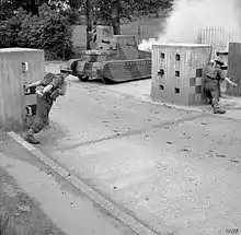 Men of the 6th Royal Berkshire Regiment, manning a roadblock, practice attacking German tanks.