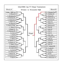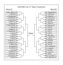After 109 preliminary tournament games and 48 main tournament games involving 160 players, Yoshiharu Habu NHK Cup and Akira Watanabe Ryūō met in the final which was broadcast on March 17, 2013. Habu had won the tournament the previous four years and was on 24 NHK Cup game winning streak; Watanabe, on the other hand, was looking for his first NHK Cup championship and also to avoid losing to Habu in the finals for the second year in a row. [lower-alpha 7] The piece toss before the game resulted in Watanabe being sente and he won the game in 109 moves, thus becoming the 62nd NHK Cup Champion.[5] The guest analyst for the final match were Takeshi Fujii 9 dan and the hosts were NHK announcer Nobuhiro Hori and female professional Rieko Yauchi. A radio broadcast of the final aired on May 3, 2013. The host was NHK announcer Taiga Sekiguchi and the guest analysts were Akira Shima 9d, Kazuki Kimura 8d and Takanori Hashimoto 8d.[6]
