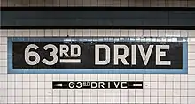 Both platforms have a blue tile band with a black border and mosaic name tablets reading "63RD DRIVE" in white sans-serif lettering on a black background and matching blue border. A few of these tablets have modern metal signs above them reading "Rego Park". Small tile captions reading "63RD DRIVE" in white lettering on black run below the tile band, and directional signs in the same style are present below some of the name tablets. The tile band was part of a color-coded tile system used throughout the IND.[16] The tile colors were designed to facilitate navigation for travelers going away from Lower Manhattan. As such, the blue tiles used at the 63rd Drive station are also used at Jackson Heights–Roosevelt Avenue, the next express station to the west, while a different tile color is used at Forest Hills–71st Avenue, the next express station to the east. Blue tiles are similarly used at the other local stations between Roosevelt Avenue and 71st Avenue.[17][18]
