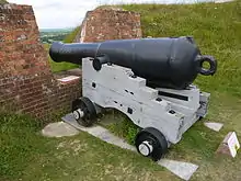 On land the 68-pounder was used extensively in British coastal defences constructed during the 1850s - notably at forts like Gomer and Elson defending Portsmouth, and Forts Victoria, Albert and Freshwater Redoubt defending the Needles Passage.[25] The 1859 Royal Commission envisaged arming the numerous new forts they proposed with the 68-pounder cannon and costed for them accordingly.[6][7] The introduction of the Armstrong gun initially led many to think that weapon would be used instead, but whilst the forts were being built, the Armstrong gun's weaknesses were exposed and the military reverted to using muzzle loaded weapons.[6] However, the advantages of rifling and the Armstrong's wrought iron construction were retained, leading to a new design of artillery piece – rifled muzzle loaders.[6]